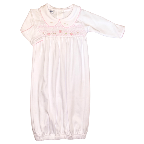 This Alice Smocked Gathered Gown is the perfect choice for busy parents. Made from soft white knit, it features a classic pink flower smocking and a Peter Pan collar with pink trim and flower embroidery. Comfort is guaranteed with knit fabric, making it ideal for baby girls.