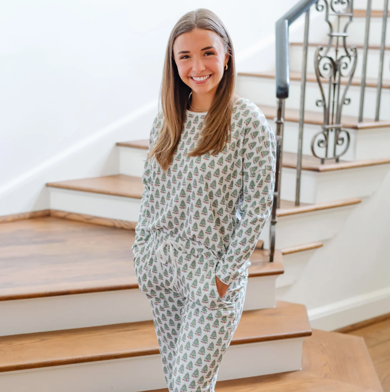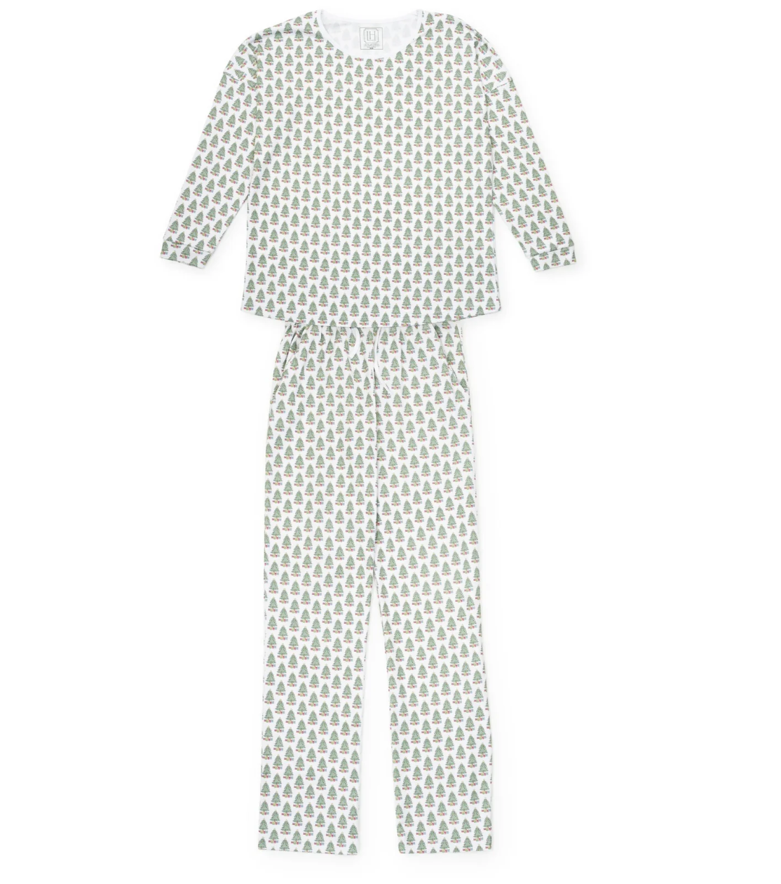 Long-sleeve top has white piping detail at neckline and cuffed sleeves, pants have a drawstring waist and pockets. Made from 100% Peruvian Cotton.