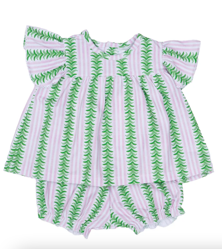 This sweet baby girls two-piece set features a soft pink and white stripe adorned with a charming green palm frond print for a fresh, Southern-inspired look. The short-sleeve top is designed with darling flutter sleeves and a gently gathered silhouette, offering both comfort and classic style.