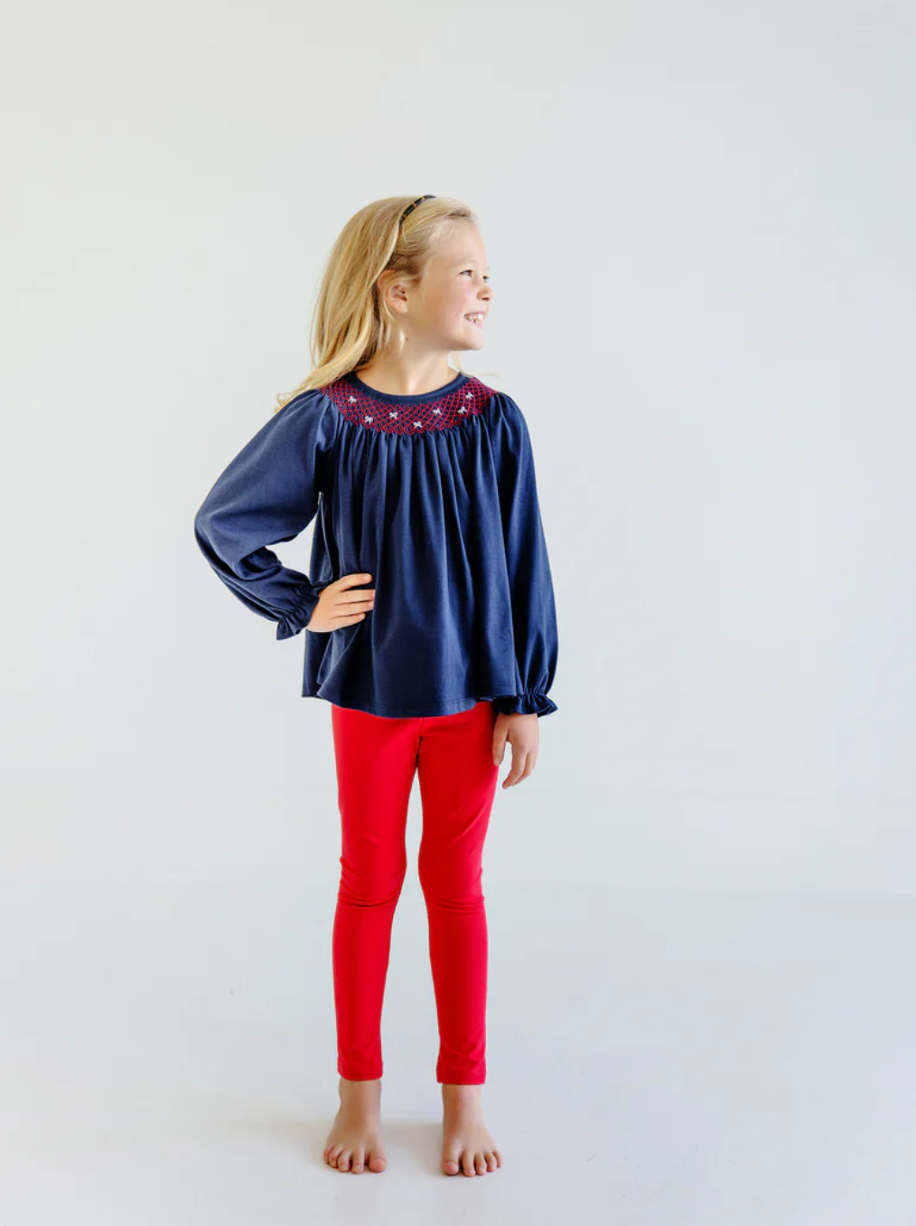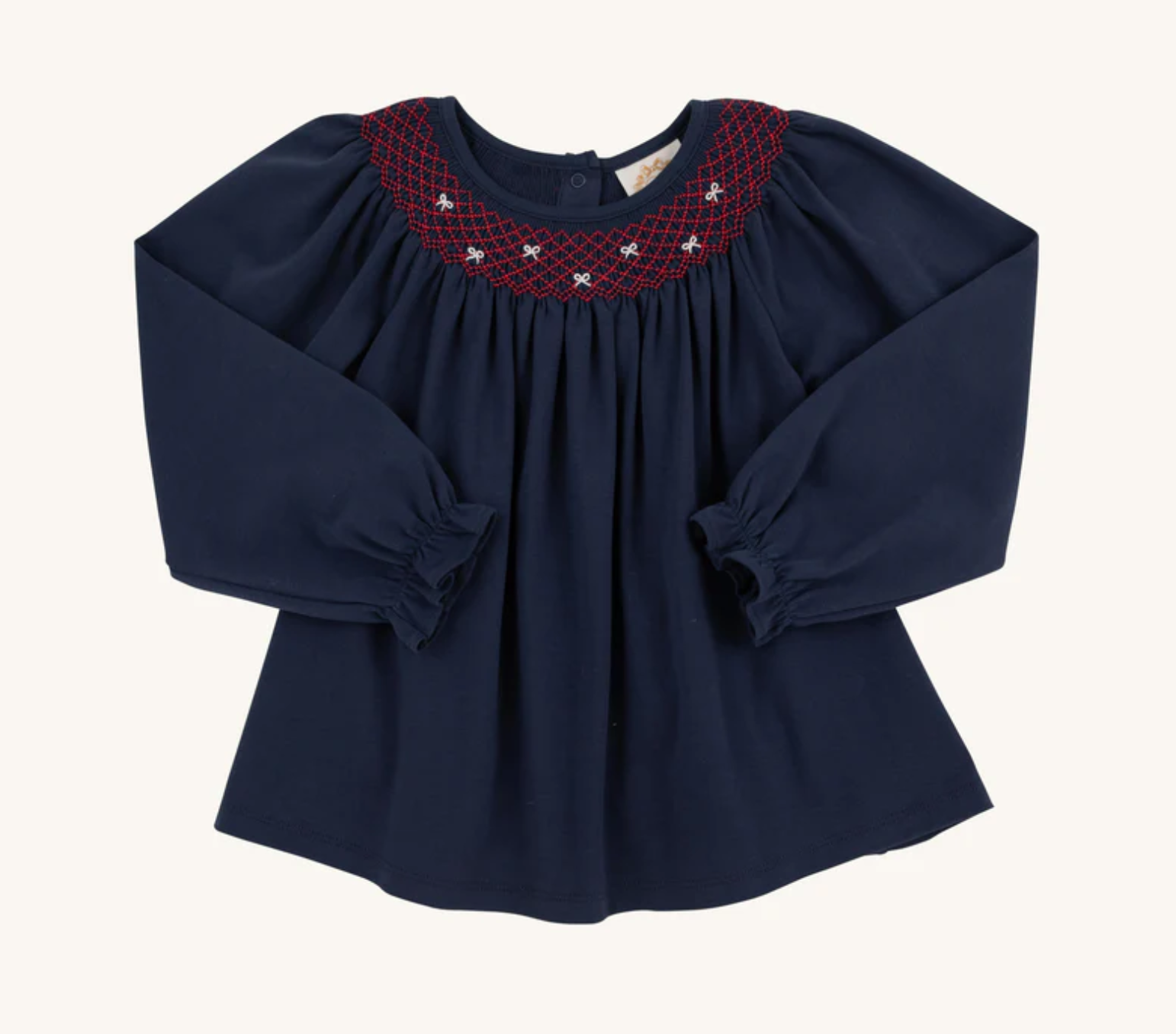 We are so in love with every detail of our Bettye Sue Smocked Top in Nantucket Navy! From the adorable fit to the darling Richmond Red and Worth Avenue White Bow smocking, this top is a must-have for your little lady.