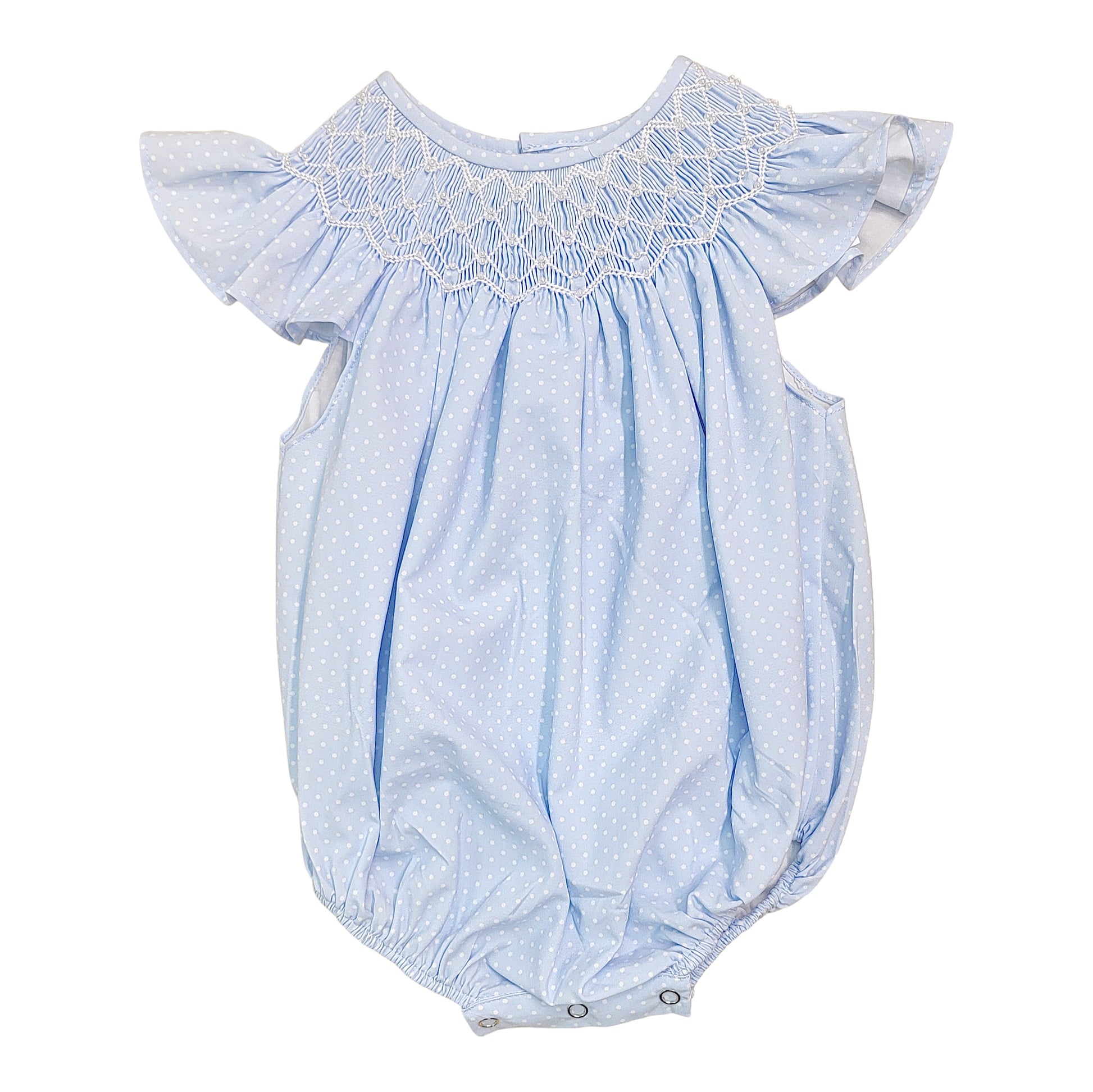 Adorable bubble silhouette with delicate flutter sleeves and charming pearl accent smocking details. Perfect for little ones who love sweet, feminine styles. The soft blue dot pattern adds playful charm while the smocking provides a polished, dressy touch ideal for special occasions or everyday elegance.