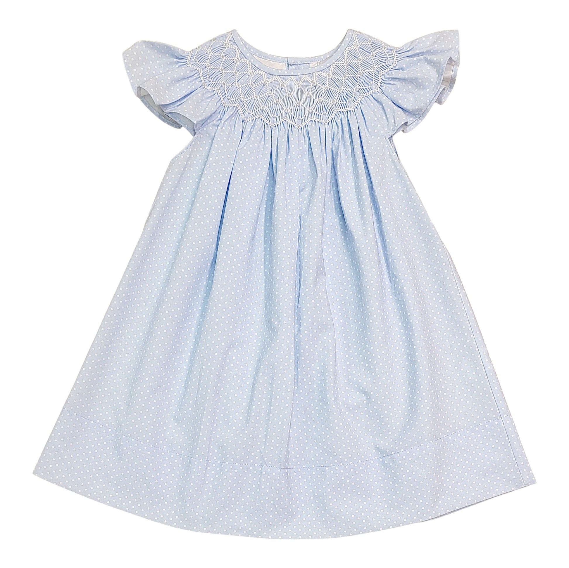 Twirl in style with this charming blue dot dress, featuring delicate flutter sleeves that dance with every movement. The bodice showcases intricate pearl-detailed smocking that adds a touch of elegance and texture. Perfect for special occasions or everyday adventures, this dress combines playful design with refined details that little ones will love to wear.