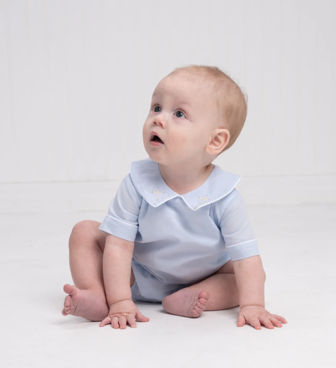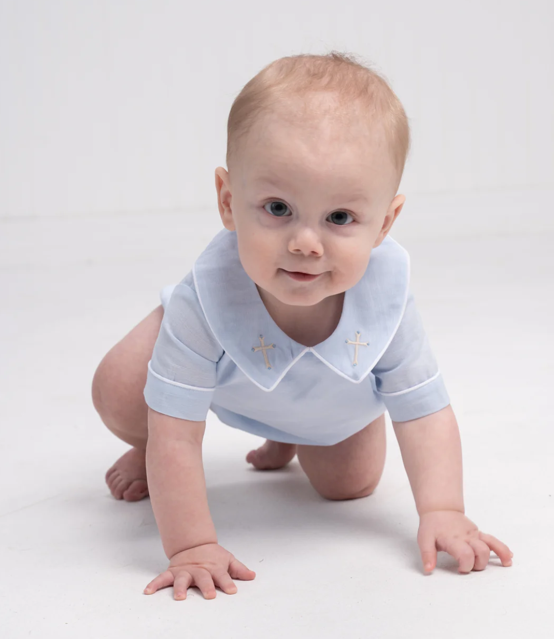 Celebrate the season in timeless elegance with the James Spring Cross Bubble. This darling light blue design features classic cross embroidery that captures refined, understated luxury—perfect for Easter gatherings and spring occasions. The soft, sophisticated palette and delicate detailing make it an effortless choice for creating memorable moments.