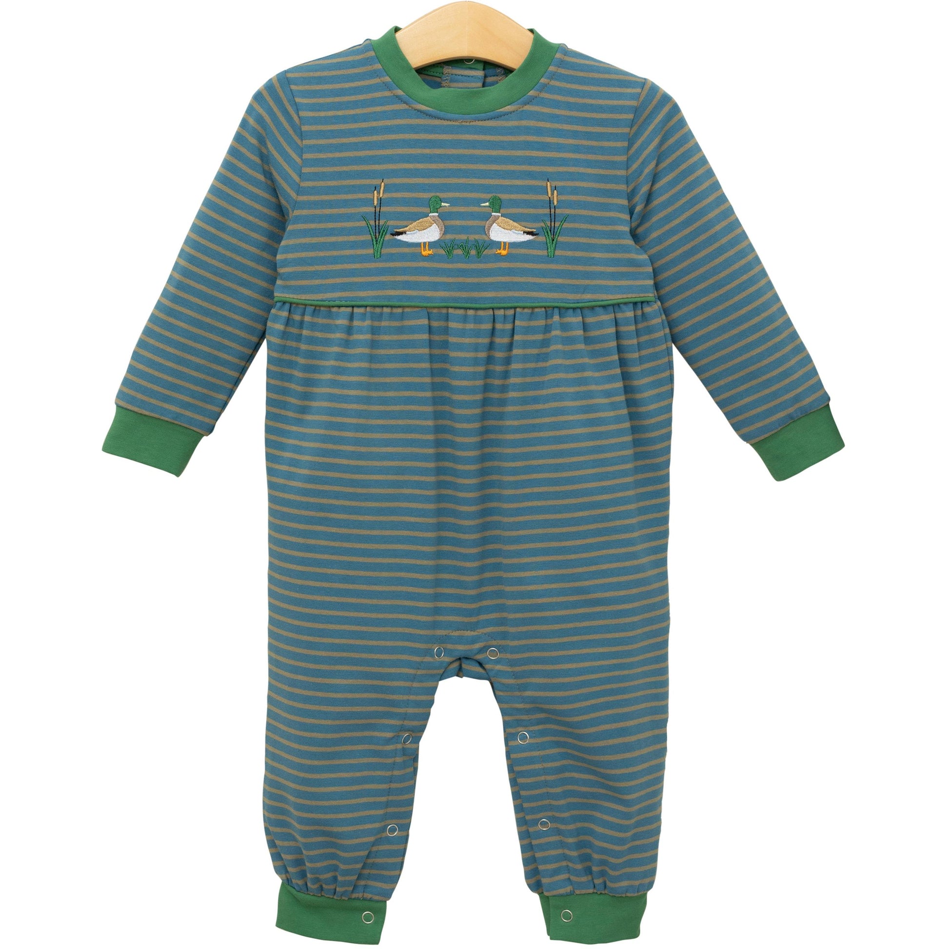 This charming romper features playful stripes and a delightful Mallard embroidery that adds a splash of whimsy. Crafted for comfort and style, it's perfect for little explorers ready to make a splash in every adventure. Easy to wear and irresistibly cute, this romper is a go-to for fun-filled days.