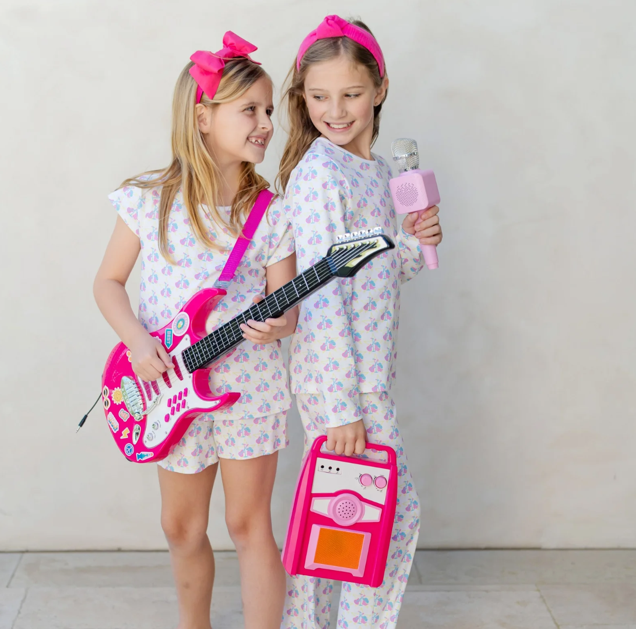 Pima cotton long sleeved top and pant set. Top has white piping detail around the neck and pants have an elastic waistband.