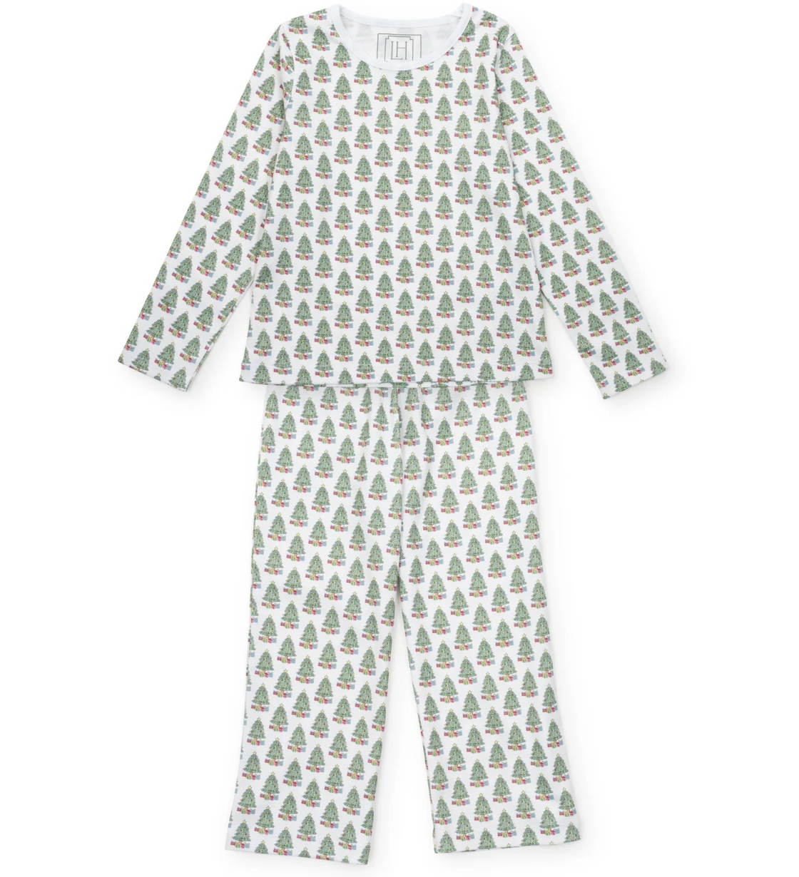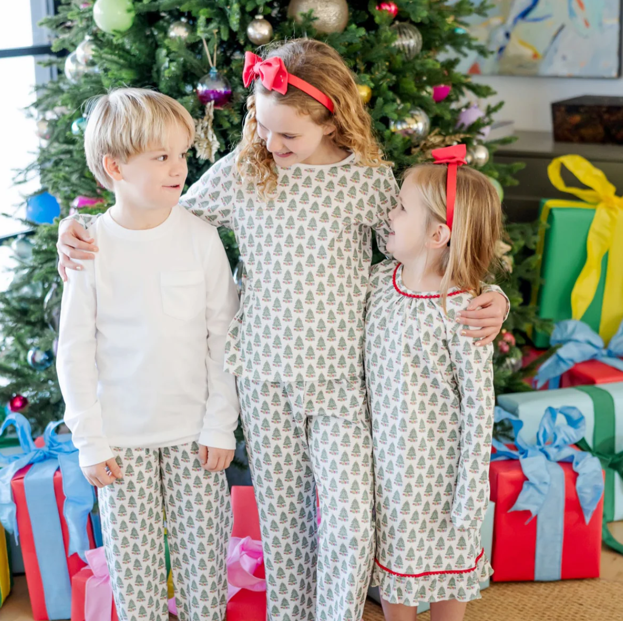 Pima cotton long sleeved top and pant set. Top has white piping detail around the neck and pants have an elastic waistband.