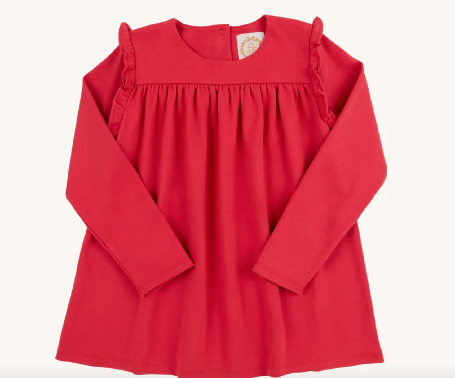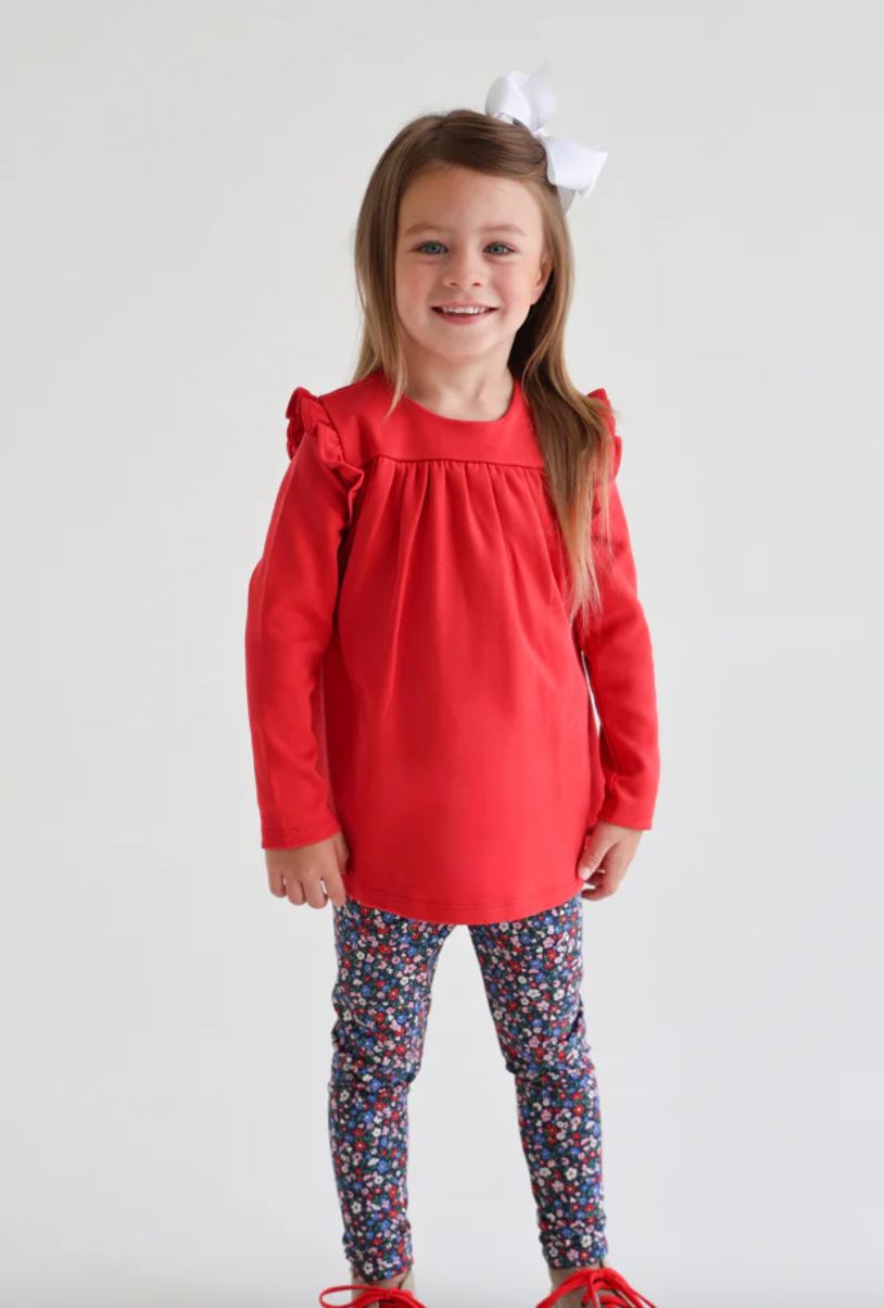 Add a pop of playful charm with the Ruby Mills Ruffle Top in Richmond Red! Its vibrant hue and cascading ruffles bring fun and flair to any little wardrobe. Perfect for twirling, exploring, and standing out in style, this top combines cute details with comfy wearability for your child's everyday adventures.